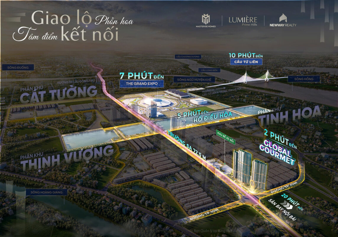 Lumiere Prime Hills tọa lạc tại vị trí vàng trên mặt đường Trường Sa (đường 5 kéo dài), thuộc phân khu Thịnh Vượng của dự án Vinhomes Global Gate Cổ Loa, Đông Hội, Đông Anh, Hà Nội. LUMIÈRE Prime Hills thừa hưởng hệ thống hạ tầng giao thông lý tưởng tại Global Gate, mang lại đặc quyền kết nối đa chiều cho cư dân qua đường bộ, đường sắt metro hay đường hàng không.